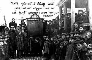 Townspeople posing with Torah Ark donated to the Lines-Hatsedek Synagogue by the Gershengorn family in memory of their mother Khaye Devoyre, 1930s. Collection of Heichal Yahaduth Wolyn. |